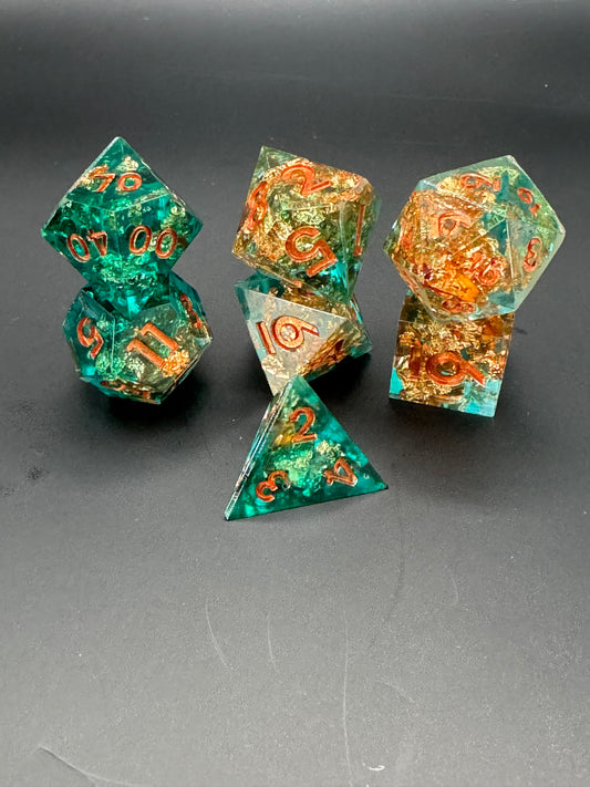 Verdigris Reliquary – Teal & Copper Polyhedral Dice Set
