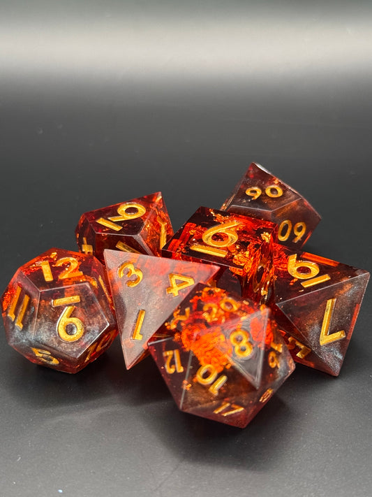 Obsidian Ember – Red Opal & Gold Flake Dice Set